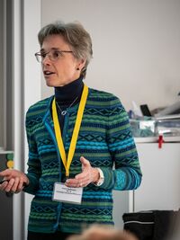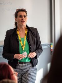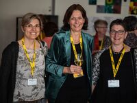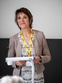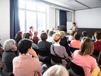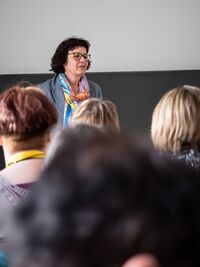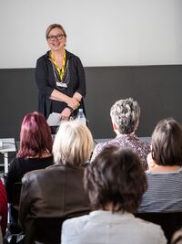 "Ein grosser Teil der Ausbildungsordner steht heute noch in meinem Büro", erzählt Ursula Schuppisser in ihrem Referat, die als Hauswirtschaftliche Betriebsleiterin vor acht Jahren diplomiert wurde. Sie absolvierte die Ausbildung berufsbegleitend als Quereinsteigerin. Frau Schuppisser betont, wie wunderbar vielseitig ihr Beruf ist – und erwähnt auch, dass dieser Beruf viel mehr Aufmerksamkeit bekommen sollte. Ihr Engagement als Ausbildnerin ist ihr deshalb umso wichtiger.