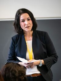 Tina Halbeisen betont in ihrem Referat, wie wichtig es ist, Mitarbeitende wertschätzend und nachhaltig zu führen. Die Quereinsteigerin ist deshalb sehr froh, dass die Mitarbeiterführung in ihrer Ausbildung ein gewichtiges Thema war. Das Problem des Fachkräftemangels leitet Frau Halbeisen aus der Führungsthematik ab: "Wir brauchen gute Vorgesetzte", sagt sie und meint damit, dass die meisten Mitarbeitenden aufgrund des Führungsstils der direkt vorgesetzten Person abspringen. Frau Halbeisen betont, dass insbesondere für die jüngeren Generationen gutes Leadership ein zentrales Bindungsinstrument ist.